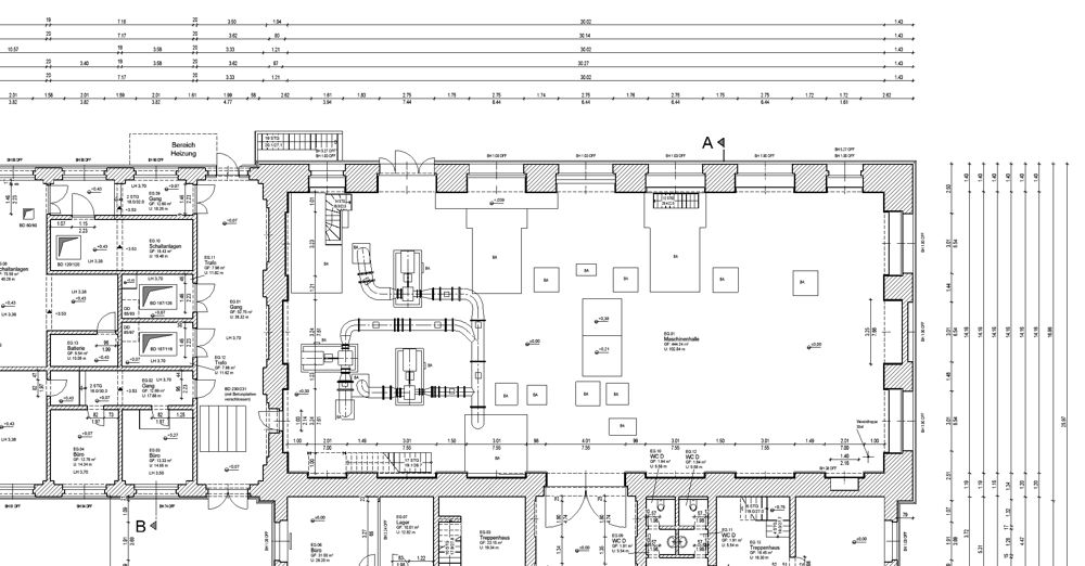 | Bestandsplanung bei Wohn- und Industriegebäuden. Vermessung an gekrümmten Bauwerken oder unzugänglichen Gebäudeteilen mittels Tachymetrie und kalibrierter Fotos. Detailgetreue Ansichten bei aufwendig gestalteten Fassaden. Aufmaß gesamter Gebäude und Anlagen oder Vermessung ausgewählter Bauwerksteile. Unsere Bestandsplanung kann problemlos mit anderen CAD-Systemen weiterbearbeitet werden oder wird von uns zu einer Umbauplanung geführt. |